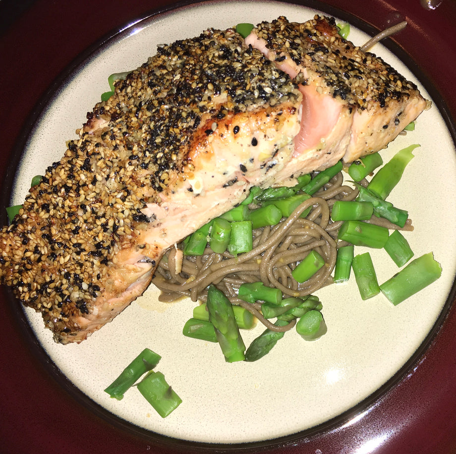 The next night was sesame-crusted salmon glazed with soy, ginger and lemon juice. The soba noodles were similarly sauced plus sesame oil. The asparagus added crunch.